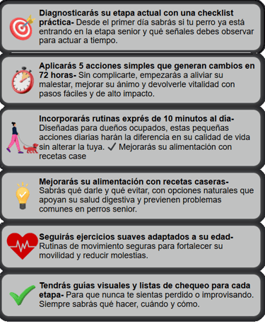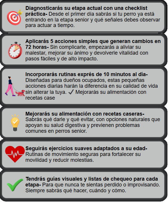 Ver a tu perro mayor con menos energía, cojeando o durmiendo demasiado… duele. La buena noticia es que no necesitas ser veterinario para ayudarlo, solo seguir un plan claro y adaptado a su edad.”